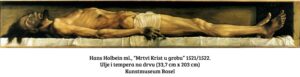 Holbein, nasuprot tome, provodi vizualnu obdukciju. Na drvetu lipe, uljem i temperama pedantno dokumentira početak ljudskog raspadanja. Njegov mrtvi Krist je blijed, gotovo maslinasto-sive kože. Rane na udovima su tamne i bez krvi. Usta poluotvorena –u smrti je klonula čeljust. To je rigor mortis (mrtvačka ukočenost) u svom najradikalnijem obliku. Holbein nam ne nudi „Otkupitelja“; ne! – kao na pladnju, on nam servira biološki kraj jednog čovjeka u svoj njegovoj odbojnosti.